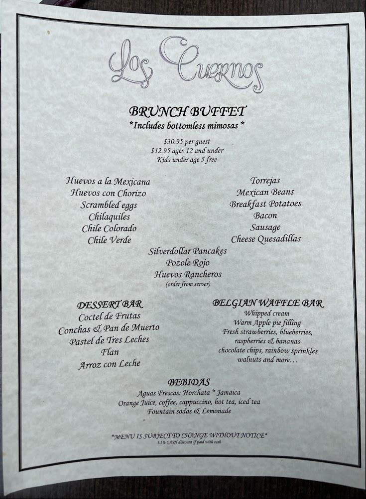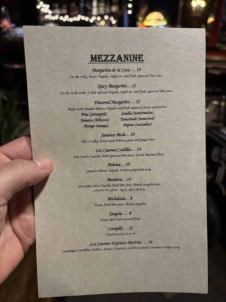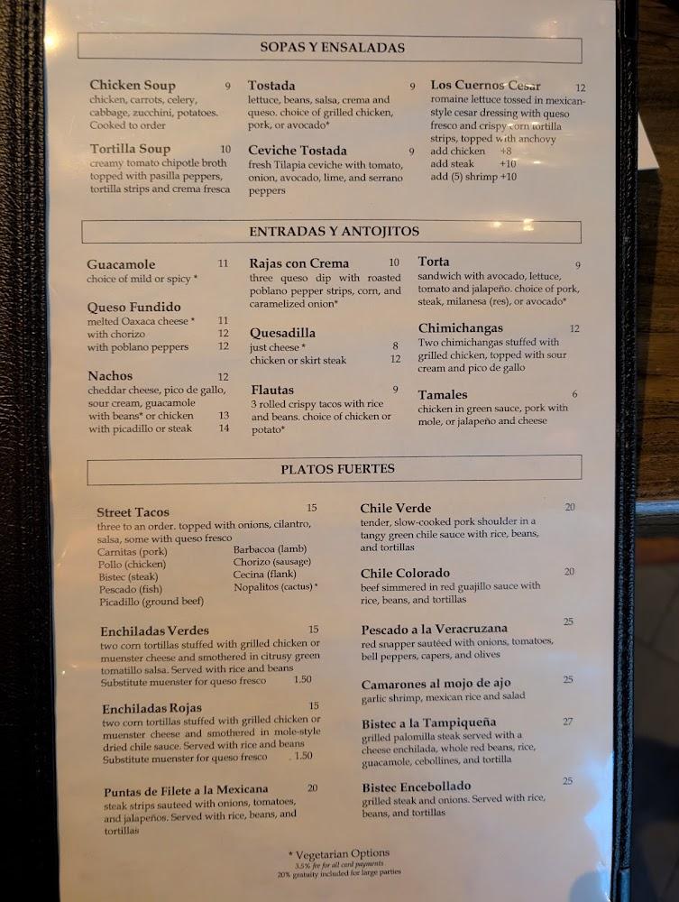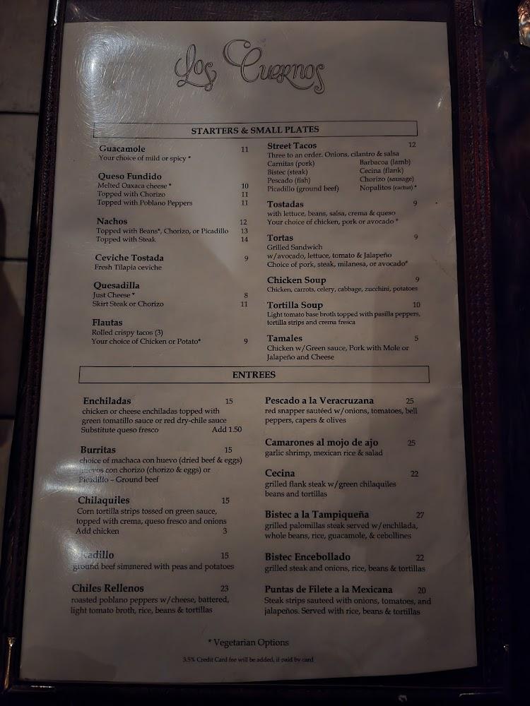 Los Cuernos' menu offers a variety of traditional Mexican dishes. Diners can savor antojitos like tacos, quesadillas, and ceviche tostadas. For heartier meals, choose entrees like enchiladas or carne asada. The price range remains reasonable, with most dishes under $30. Sides like rice and beans complement the main courses well. Desserts, including the famous tres leches, are a sweet finish. Guests often appreciate the fresh guacamole prepared to order. The drink menu features signature cocktails and refreshing aguas frescas.